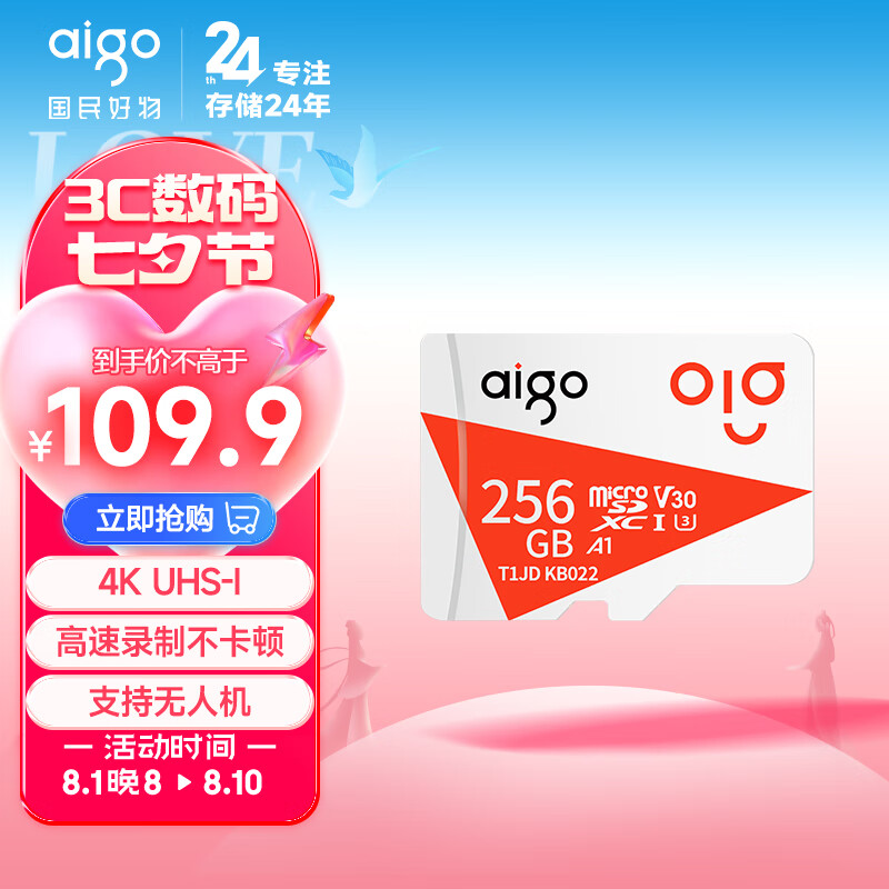 爱国者(aigo)256GB TF(MicroSD)存储卡 U3 A1 V30 4K内存卡 相机行车记录仪监控摄像头储存 T1JD读速100MB/s价格:109.90元!