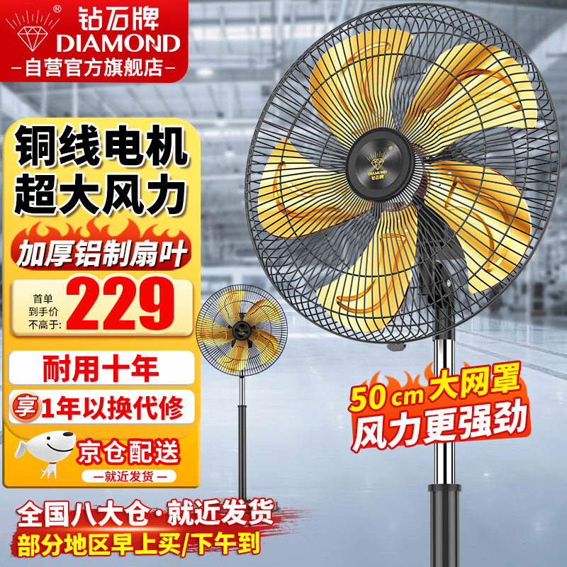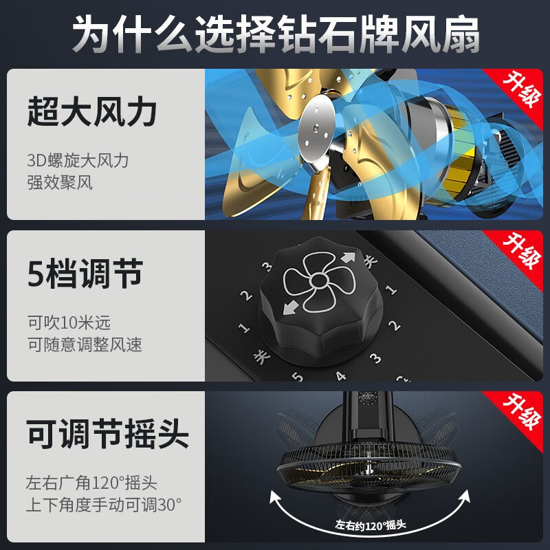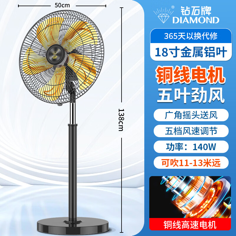 钻石牌(DIAMOND) 工业风扇落地扇家用立式电风扇大风力摇头强力电扇客厅商用工厂车间铝叶商业风扇 HF-1802金色五叶 推荐商铺/车间价格:259.00元!