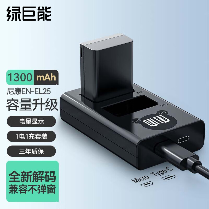 绿巨能(llano)尼康EN-EL25相机电池Zfc电池充电器Z30/Z50/Z系列微单相机电池充电器 一电双充套装价格:229.00元!