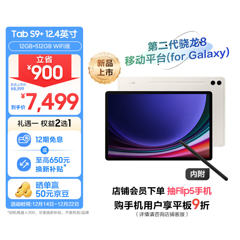 三星(SAMSUNG)平板电脑2023款Tab S9+ 12.4英寸 12G+512G WIFI 骁龙8Gen2 顺滑全视屏 内附Spen 云雾金价格:7499.00元!