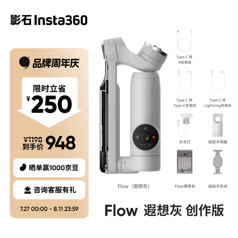 影石(Insta360)Flow手机云台稳定器 可折叠伸缩自拍杆智能跟随三轴增稳防抖vlog拍摄手持稳定器(灰色创作版)价格:948.00元!