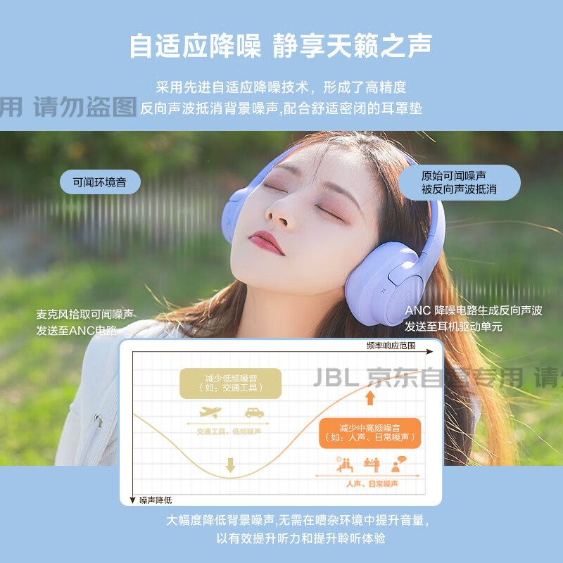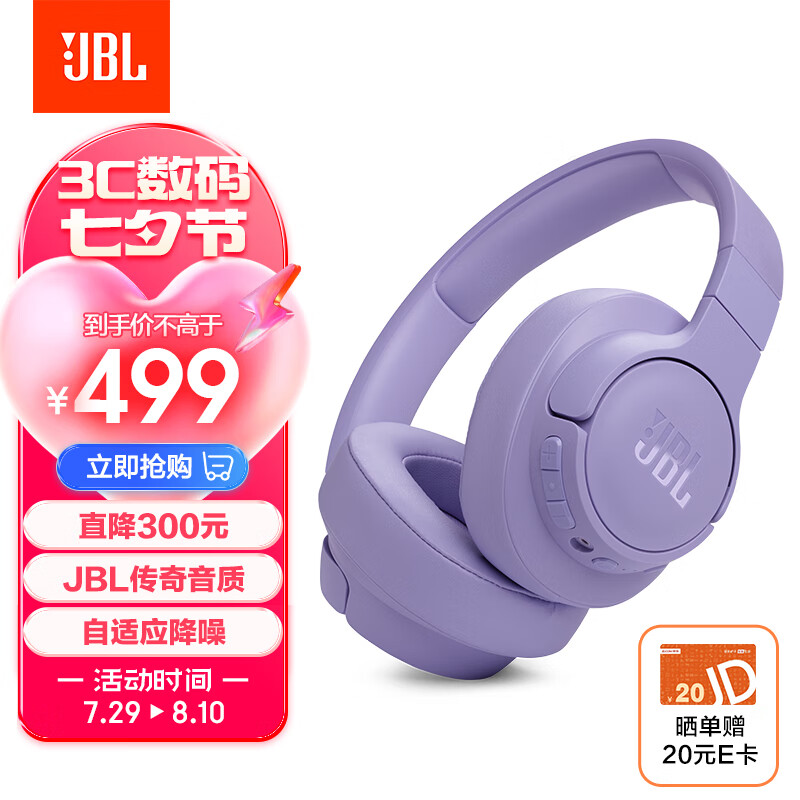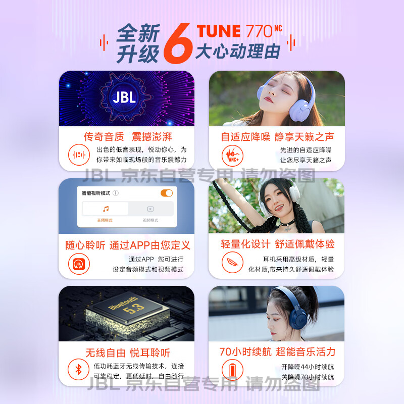 JBL T770NC无线蓝牙降噪耳机 头戴式主动降噪游戏耳机 70小时续航 青黛紫价格:599.00元!