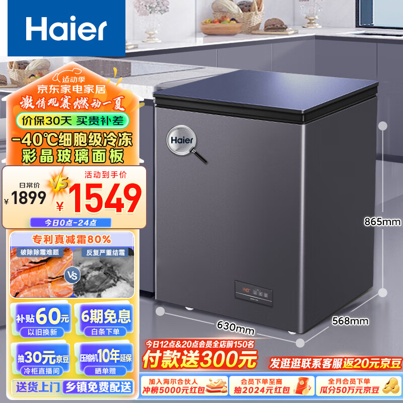 海尔(Haier)142升-40℃彩晶低霜小冰柜家用商用 冷藏柜冷冻柜冰柜小型小冰箱小型冷柜BC/BD-142GHEPGD以旧换新价格:1549.00元!