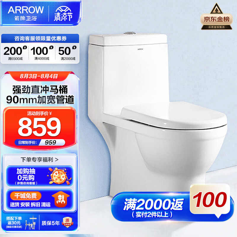 箭牌(ARROW)马桶家用直冲式坐便器大冲力座便坐厕 1级水效 全管施釉AEB12601L价格:929.00元!
