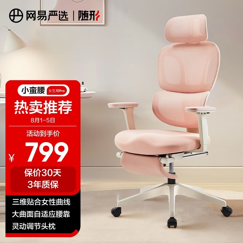 网易严选小蛮腰女生椅春云粉 人体工学电脑椅办公电竞老板椅会议学习座椅价格:1099.00元!