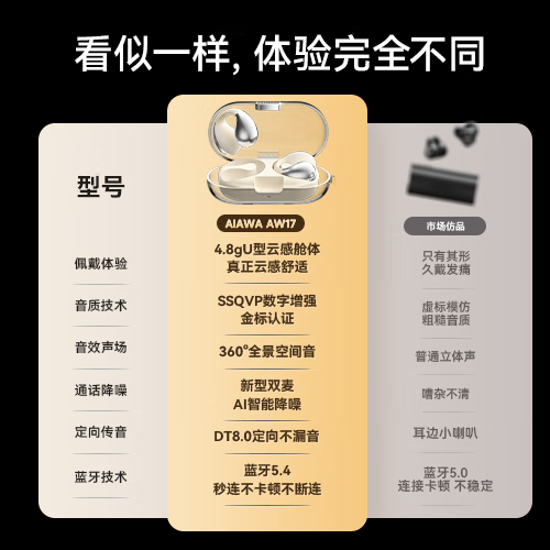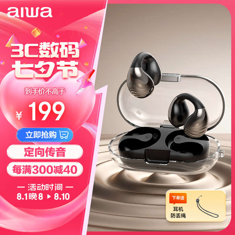 aiwa爱华AW17 开放式蓝牙耳机 骨传导概念无线夹耳式不入耳运动跑步通话降噪长续航 适用于苹果华为 黑价格:199.00元!