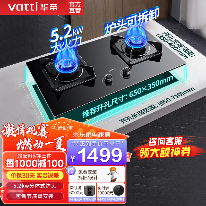 华帝(VATTI)i10075B燃气灶官方5.2kw火力灶具台嵌两用一级能效钢化玻璃可调节安装开孔尺寸 燃气灶 天然气5.2kW价格:1799.00元!