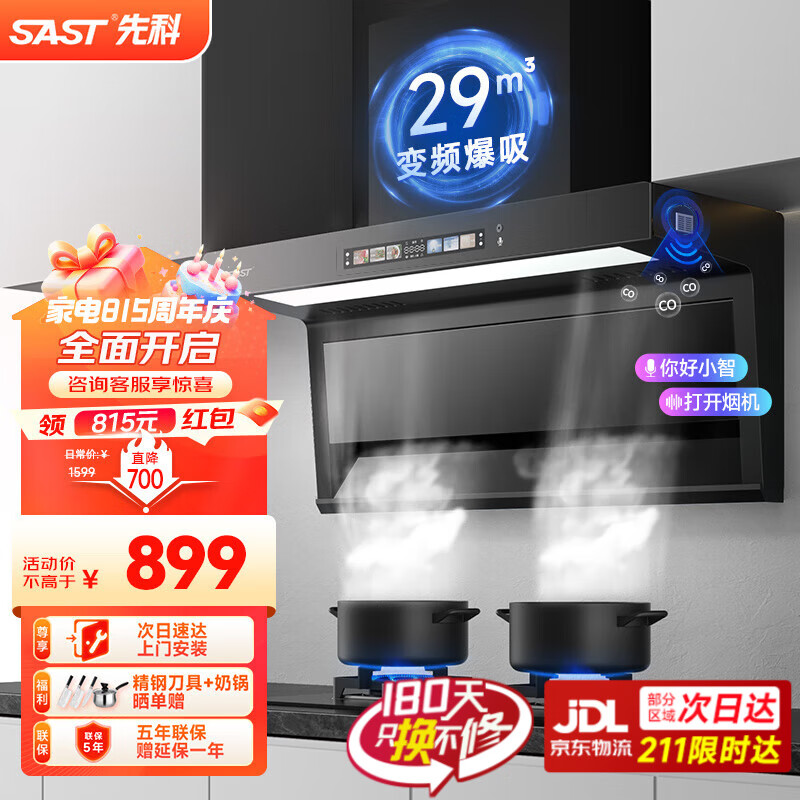 先科(SAST)顶侧双吸抽油烟机燃气灶烟灶套装家用厨房大吸力脱排式7字吸油烟机灶具套装 升级变频/29变频立方+烟感+语音+彩屏价格:1499.00元!