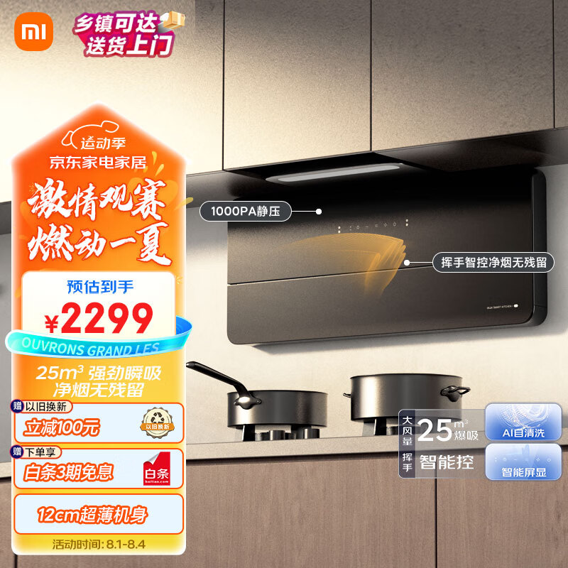米家小米智能超薄近吸油烟机S1 25大吸力小尺寸智能变频侧吸抽油烟机 挥手智控烟灶联动套装MJ07价格:2299.00元!