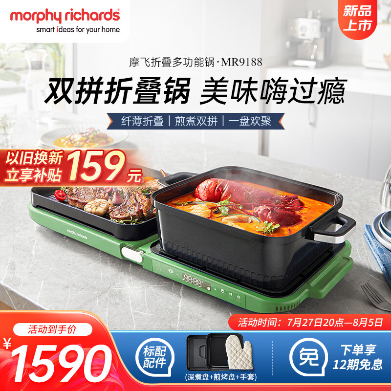 摩飞电器(Morphyrichards)折叠多功能锅 家用聚会嗨吃电火锅电煮锅电炒锅电烧烤炉烤涮一体不沾煎烤料理锅【标配】MR9188绿价格:1590.00元!
