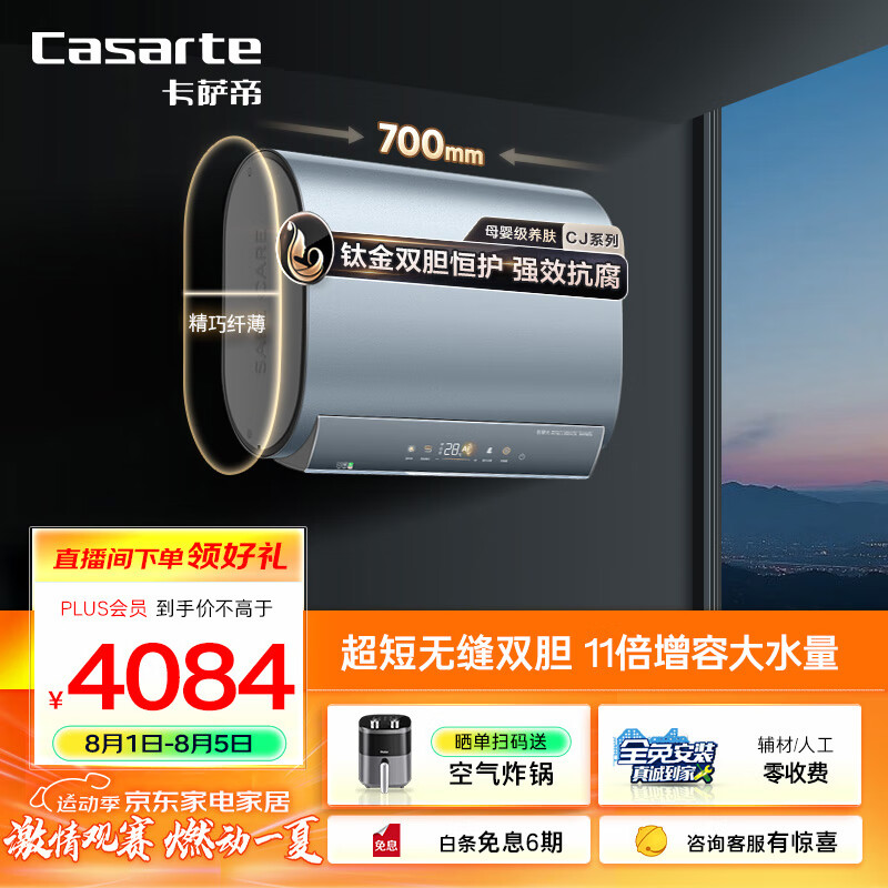卡萨帝(Casarte)60升储水式电热水器家用超薄钛金无缝双胆扁桶型短款双驱速热一级能效CEC6005-CJ5U1【以旧换新】价格:4299.00元!