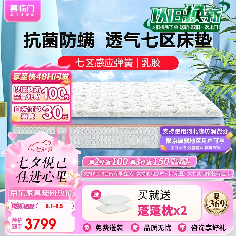 喜临门进口高纯乳胶七区独袋弹簧黄麻床垫 软硬两用床垫 漾2x2.2米价格:3799.00元!