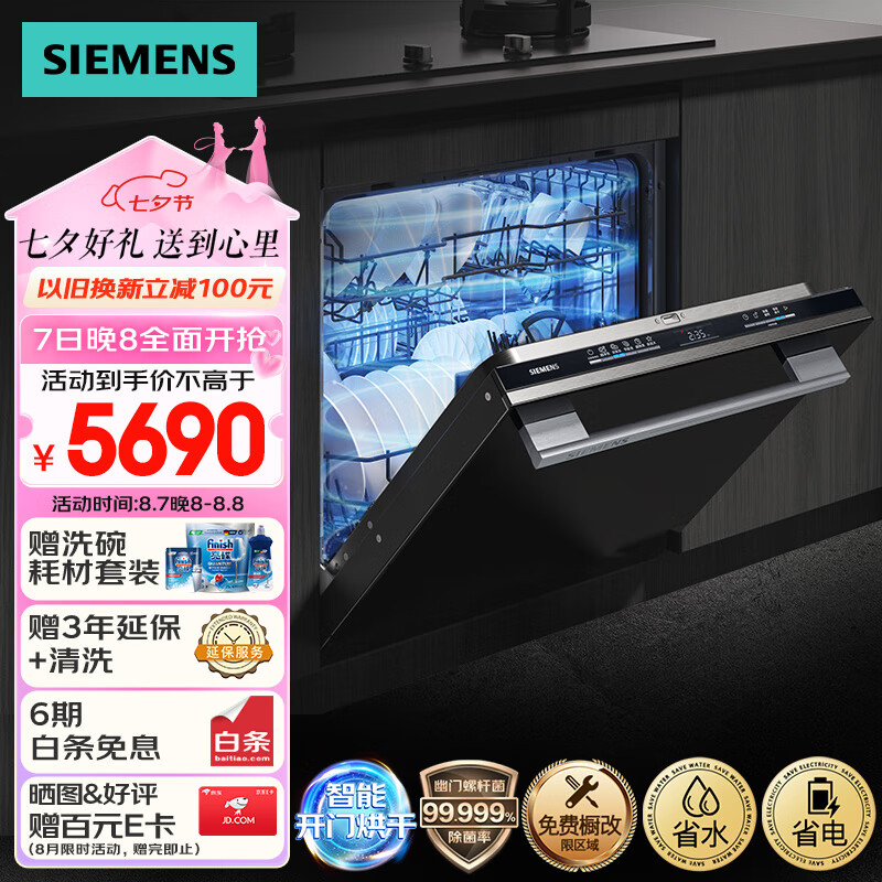 西门子(SIEMENS)12套大容量灶下大内腔嵌入式洗碗机 除菌消毒一体 一级水效 智能开门烘干 高700mm SE43EB66KC黑色价格:5690.00元!