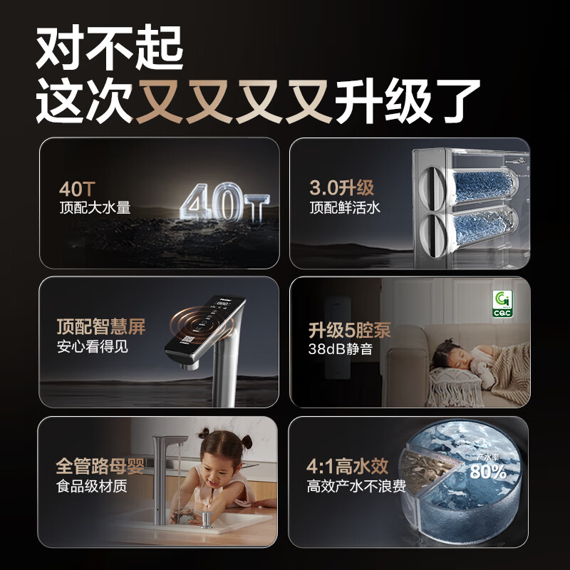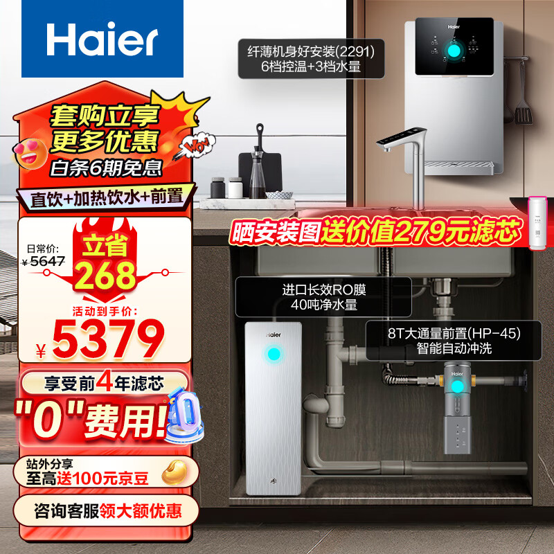 海尔(Haier)直饮加热净水器清梦1000Gpro5年进口膜+前置过滤器+管线机HKC2400-R882D2U1+HP45+HGR2291-JU1价格:5379.00元!