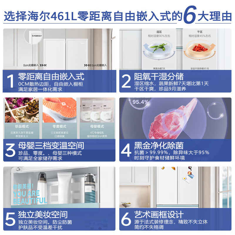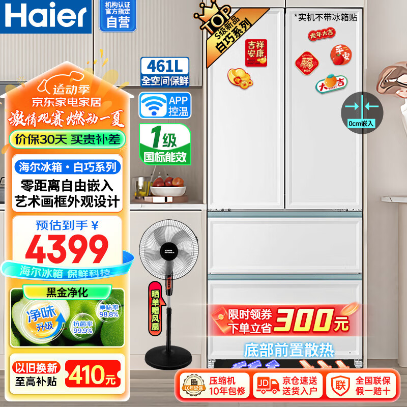 海尔(Haier)白巧冰箱461L白色法式多门零嵌入式底部散热风冷无霜一级能效超薄黑金净化BCD-461WGHFD45W9U1价格:4599.00元!
