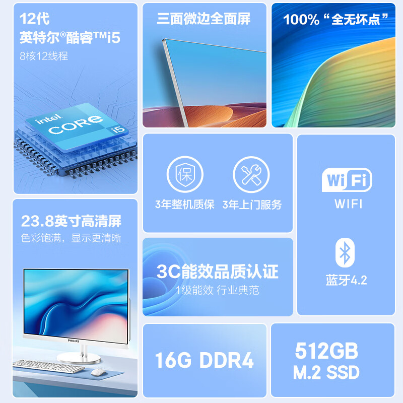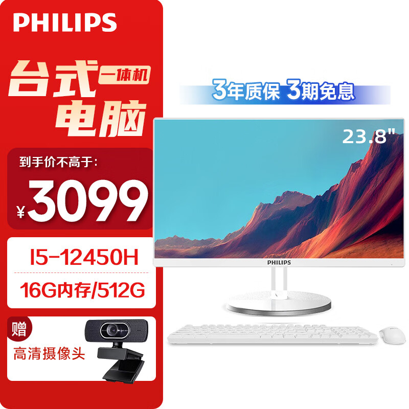 飞利浦(PHILIPS)S9 23.8英寸台式一体机电脑主机 商用家用办公(12代i5 12450H 16G 512GSSD 双频WiFi 3年质保)白价格:3099.00元!