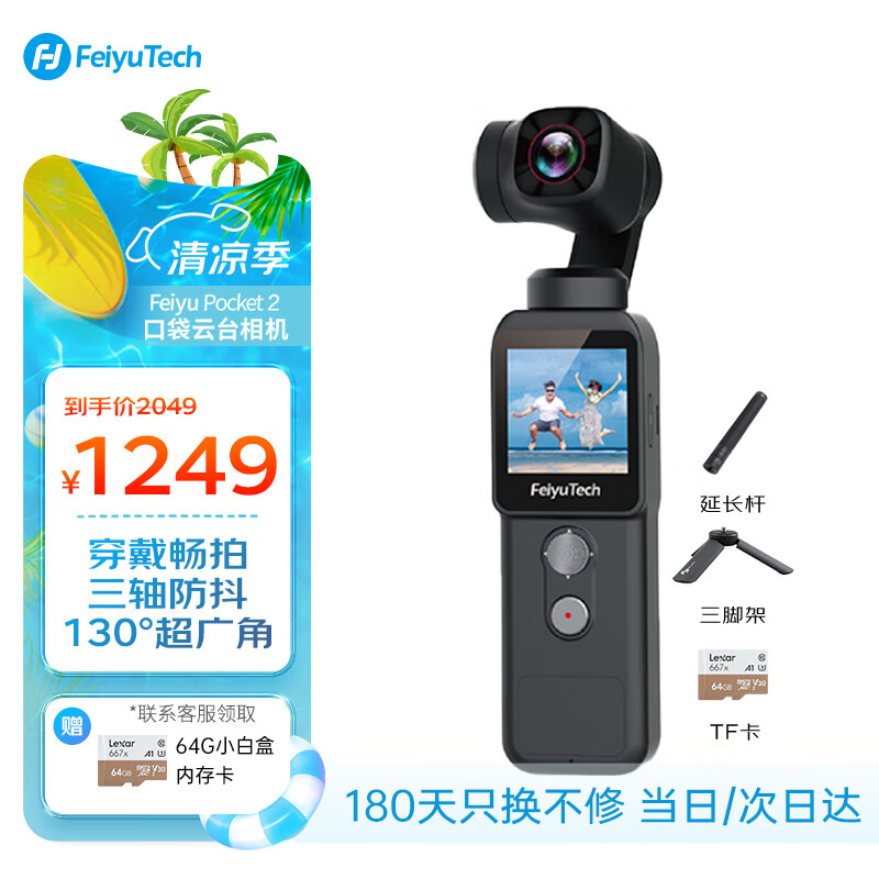 FeiyuTech飞宇Feiyu pocket2口袋云台相机套装 手持高清增稳vlog摄影机 标配+TF卡+三脚架+延长杆价格:1249.00元!