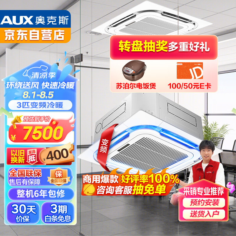 奥克斯(AUX)中央空调3匹变频冷暖天花机嵌入式吸顶机吊顶空调商用天井机适用30-48㎡ KFR-72QW/BPR3YC3(B2)价格:7500.00元!