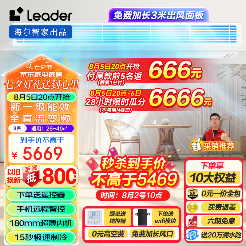 Leader海尔智家出品3匹P元气风管机一拖一级能效中央空调嵌入式全直流变频客厅空调 KFRd-72NW/73ED81TU1价格:5699.00元!