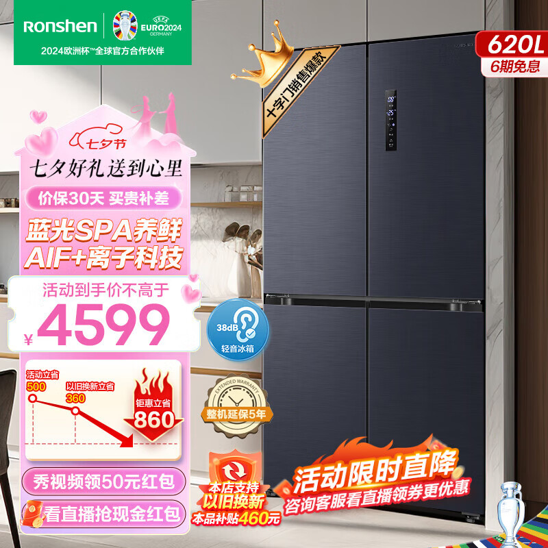容声(Ronshen)620升十字对开四门大容量一级能效超薄变频净味风冷无霜四门电冰箱BCD-620WD19FP 灰色 青山黛价格:4599.00元!