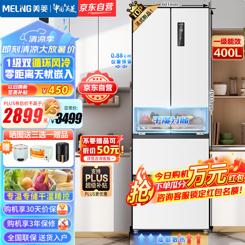 美菱(MeiLing)【无忧嵌】400升法式多门冰箱家用一级能效超薄零嵌入式风冷冰箱底部散热电冰箱BCD-400WP9CZX白价格:3499.00元!