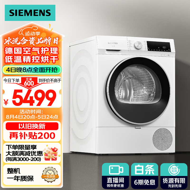 西门子(SIEMENS) 烘干机家用 10公斤热泵干衣机 除菌除螨 蚕丝被专护 WQ53A2D00W价格:5699.00元!
