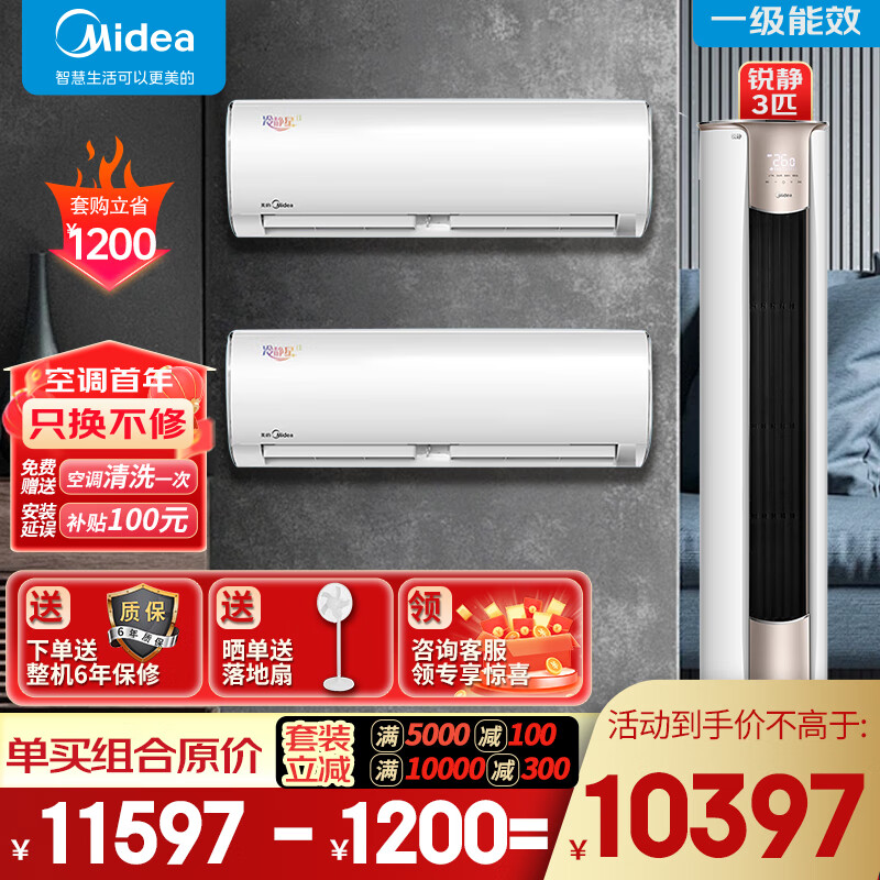 美的(Midea)空调套装二室一厅新一级能效全直流变频冷暖空调一套购齐双节能冷静星挂机+锐静柜机价格:10397.00元!