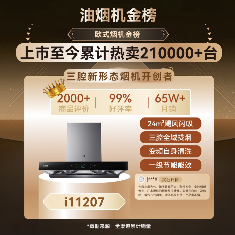 华帝(VATTI)官方欧式抽油烟机灶具热水器套装厨房三件套家用三腔变频创世S7自动清洗24立方爆炒风量i11207 【省钱三件套】207+73B+12151恒温16L价格:4898.00元!