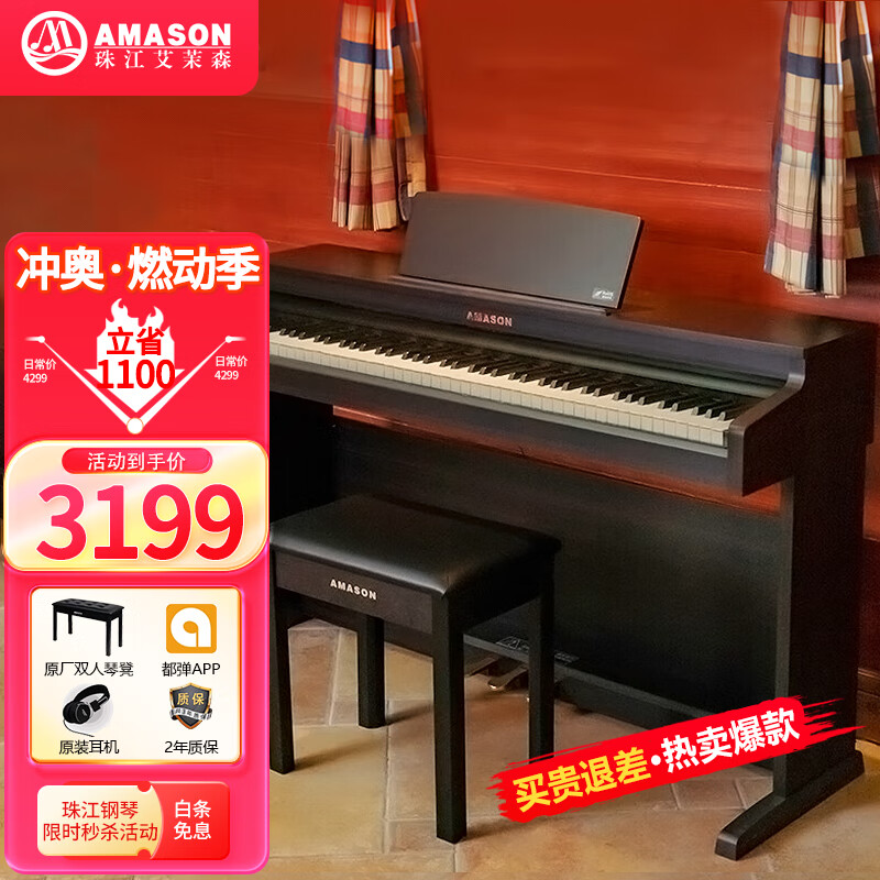 艾茉森珠江钢琴智能数码88键重锤立式儿童初学成人家用考级电钢琴V05S价格:3899.00元!