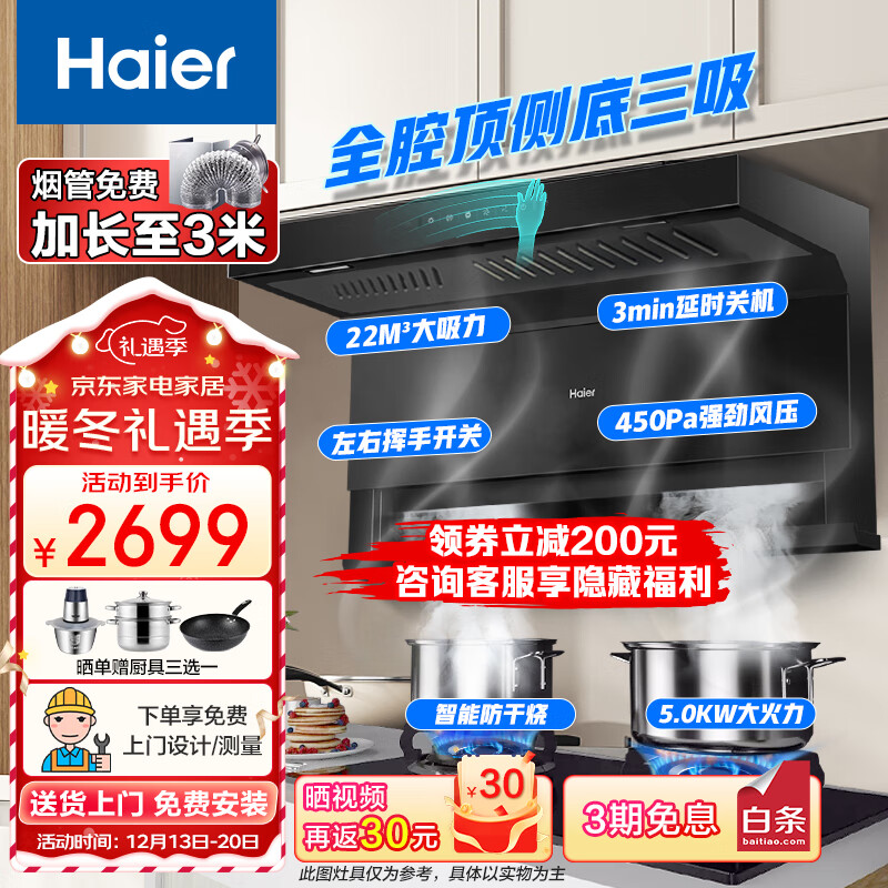 海尔(Haier)抽油烟机燃气灶套装 7字型顶侧双吸挥手智控 22m3大吸力吸油烟机家用 EC710烟灶套装5.0KW灶[家电]价格:2899.00元!