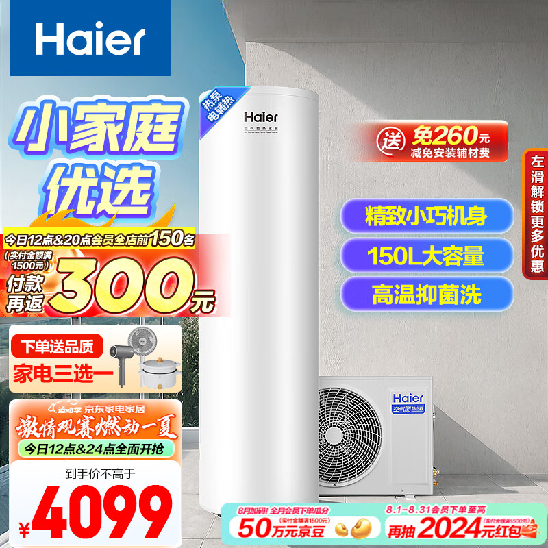 海尔(Haier)空气能热水器150升包安装 75℃高水温杀菌净水洗APP智控电辅 KF70/150-B3-EPU1(小户型优选)价格:4099.00元!