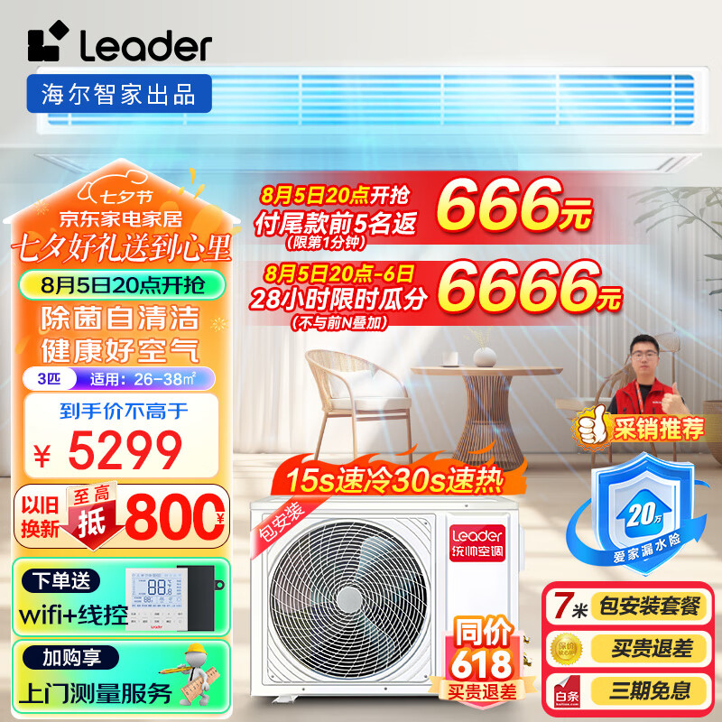 Leader海尔智家出品3匹风管机一拖一中央空调3p嵌入式客厅空调直流变频除菌自清洁KFRd-72NW/72DDB82ST价格:5299.00元!