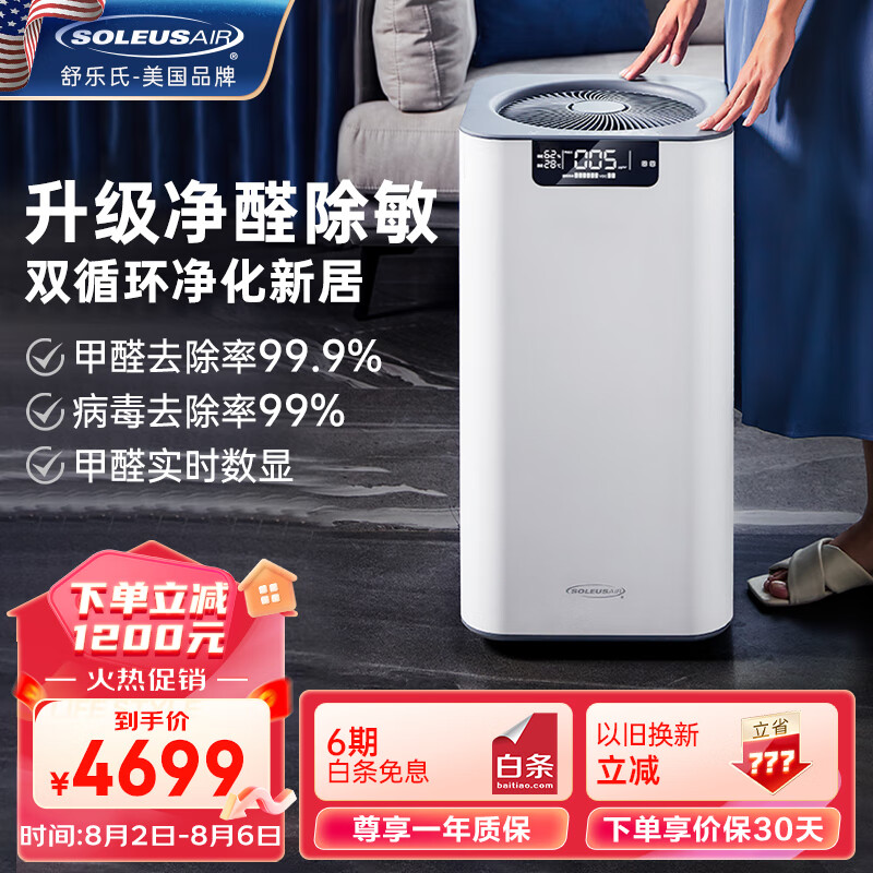 SOLEUSAIR舒乐氏空气净化器宠物除菌猫毛家用吸附除甲醛除花粉过敏原异味除甲醛分解除雾霾 等离子除菌A02价格:4699.00元!
