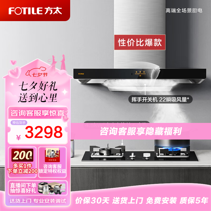 方太(FOTILE)油烟机灶具套装两件套吸抽油烟机灶具燃气灶天然气灶具欧式升级22风量烟灶套装EMC2A+02-TH33B 店铺主推 烟灶组套价格:3298.00元!