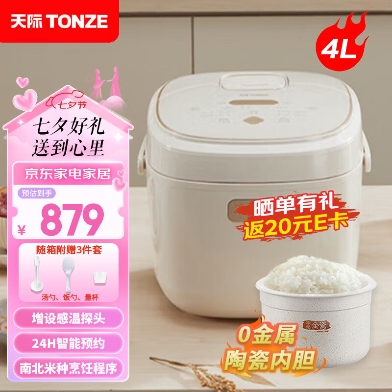 天际(TONZE)电饭煲4L 家用陶瓷内胆不粘电饭锅 大容量智能预约0涂层饭煲多功能3-8人煮粥蒸米饭锅 BYQC22C40GC价格:879.00元!