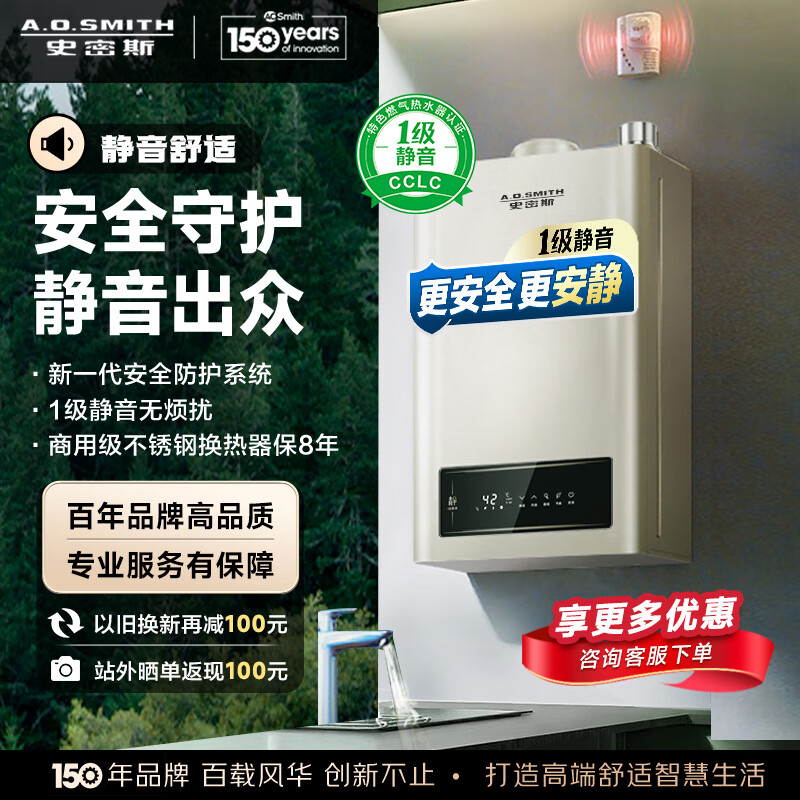 史密斯(A.O.SMITH)16升燃气热水器 1级静音 恒温大水量 家用抗风防冻 JSQ31-TEW 更更安静 以旧换新价格:4198.00元!