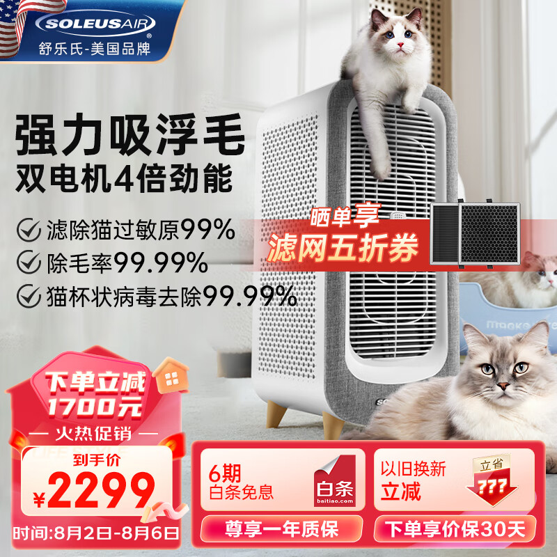 SOLEUSAIR舒乐氏宠物精灵空气净化器 吸猫毛狗毛除过敏源 猫毛净化器 消毒除异味KJ500F-C01价格:2299.00元!