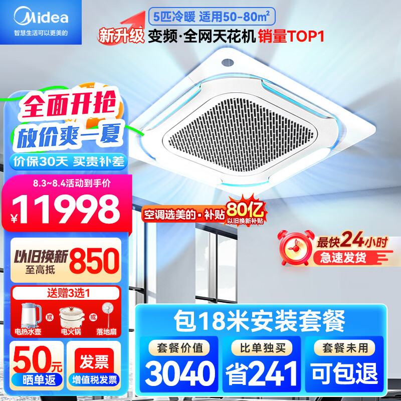 美的(Midea)5匹天花机空调吸顶吊顶空调 商用中央空调嵌入式一拖一380v包18米铜管安装RFD-120QW/BSDN8Y-D(B3)价格:11998.00元!
