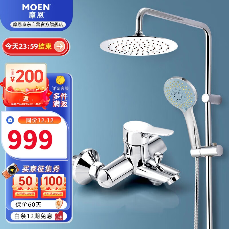 摩恩(MOEN)淋浴花洒套装 多功能增压手持喷头 8寸不锈钢圆形大顶喷龙头套装价格:1149.00元!