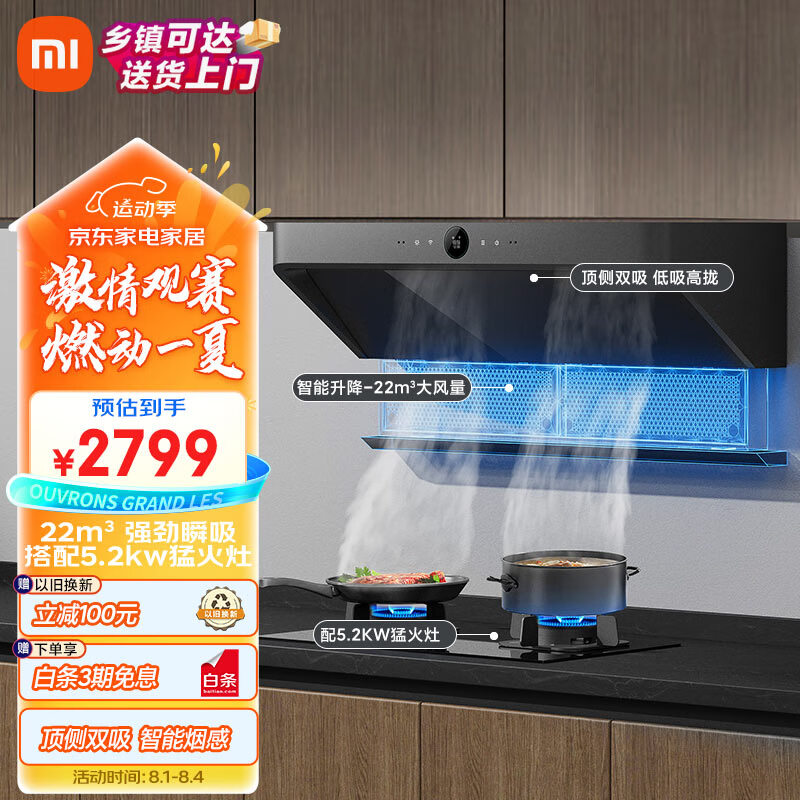 米家小米智能变频升降抽油烟机S1 22大吸力小尺寸顶侧双吸油烟机燃气灶套装 烟灶联动 5.2kW天然气价格:2799.00元!