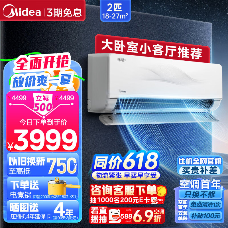 美的(Midea)空调 2匹挂机 鲜逸S 新一级能效 变频冷暖 壁挂式空调 客厅柜机 KFR-46GW/N8XY1-1价格:3999.00元!