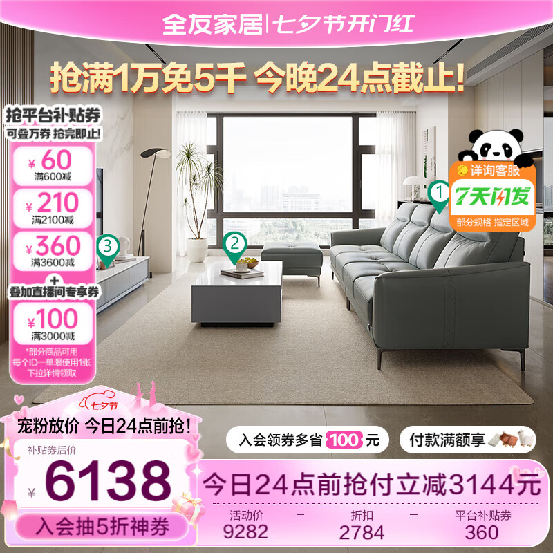 全友家居 简约客厅3件套装102710皮沙发岩板茶几电视柜主柜客厅家具价格:9282.86元!