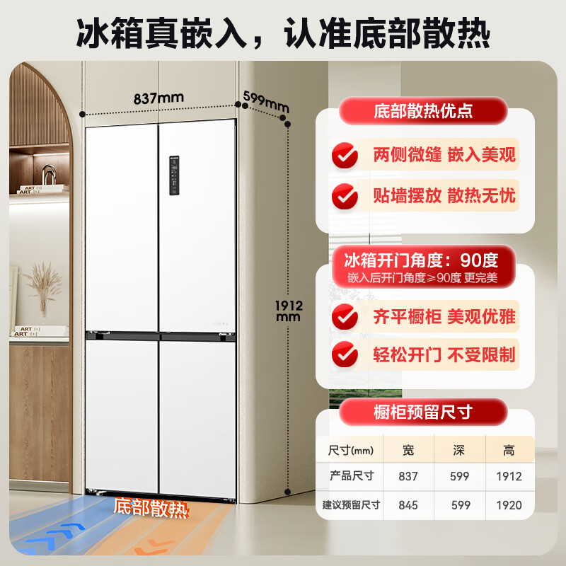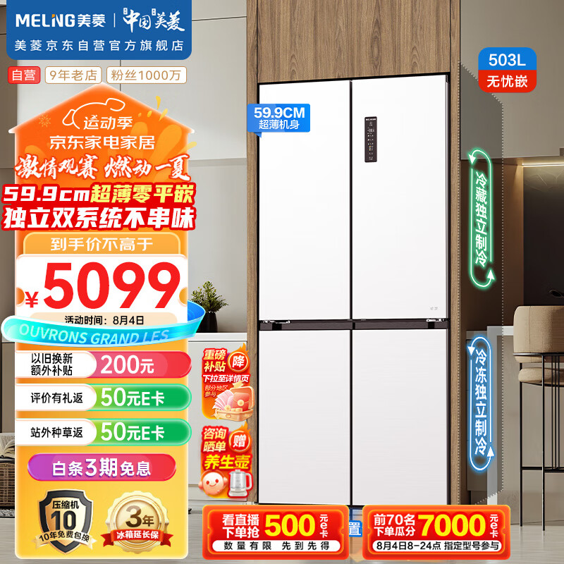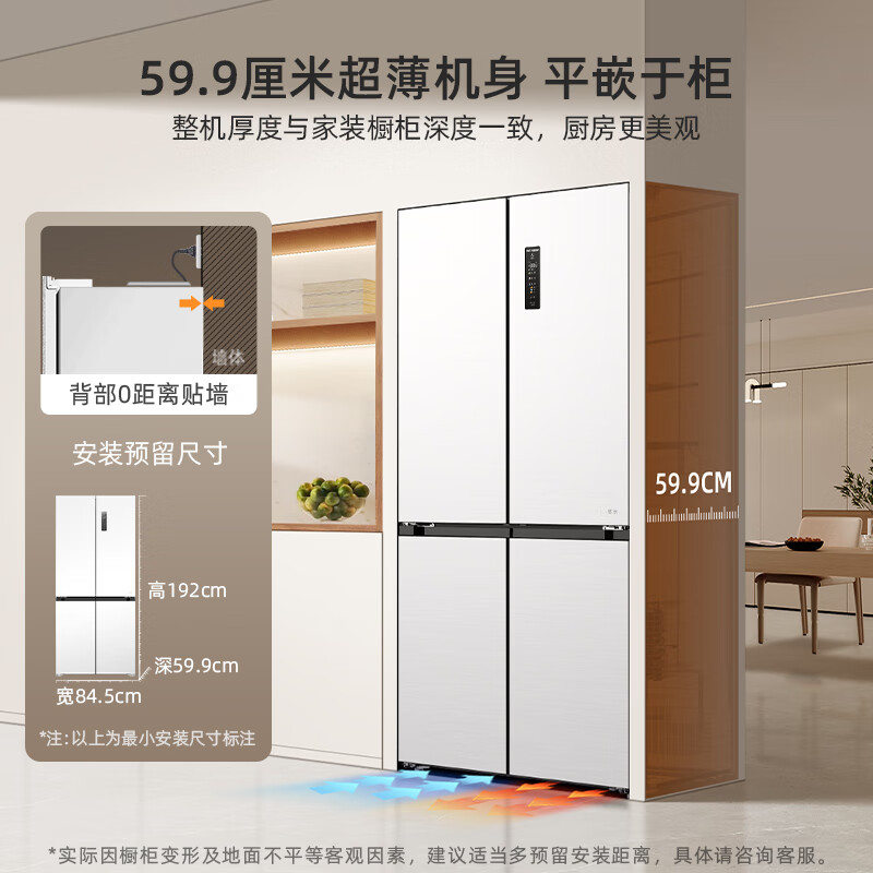 美菱(MeiLing)503升十字双开对开四开门超薄零嵌入式冰箱家用无霜一级变频双系统双循环大容量BCD-503WPU9CZX白价格:5599.00元!