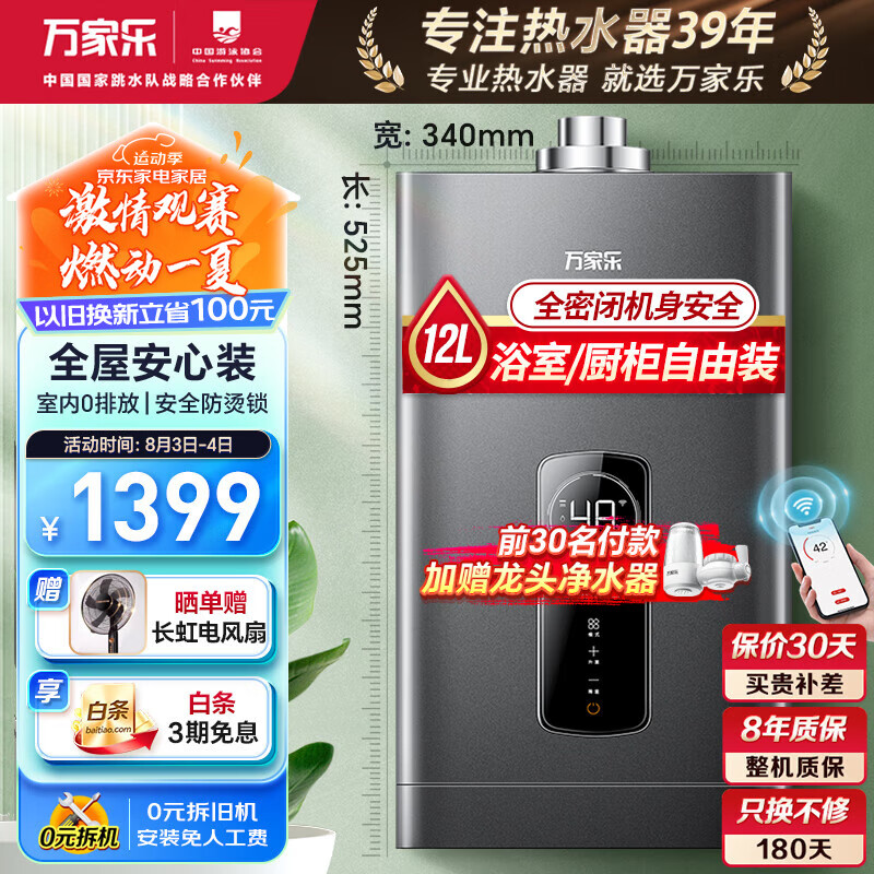 万家乐JSG24-12RH2平衡式燃气热水器即热智能恒温可装浴室 ECO节能 WIFI智控 12L 平衡机浴室专用 天然气价格:1499.00元!