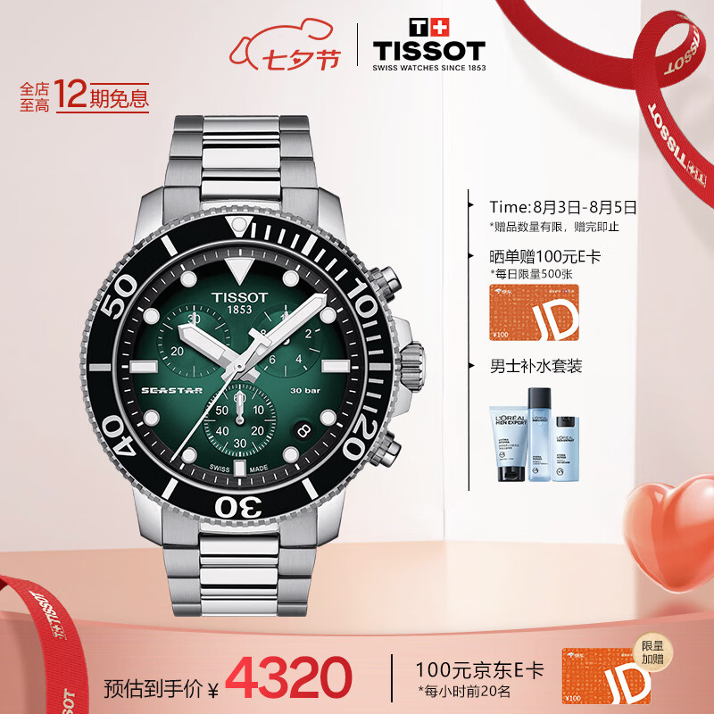 天梭(TISSOT)瑞士手表 海星系列腕表 石英男表 七夕送男友T120.417.11.091.01价格:4800.00元!