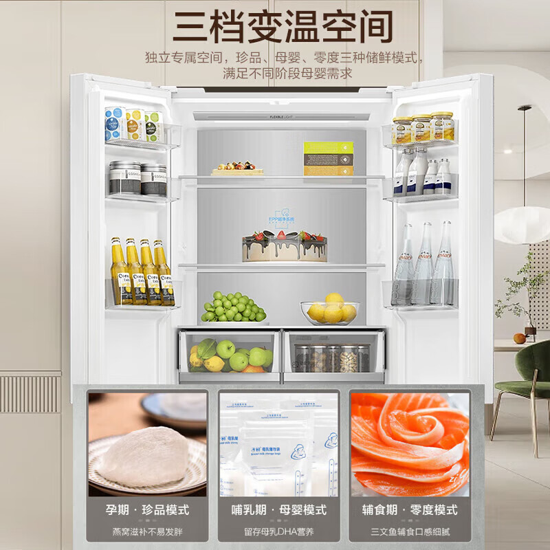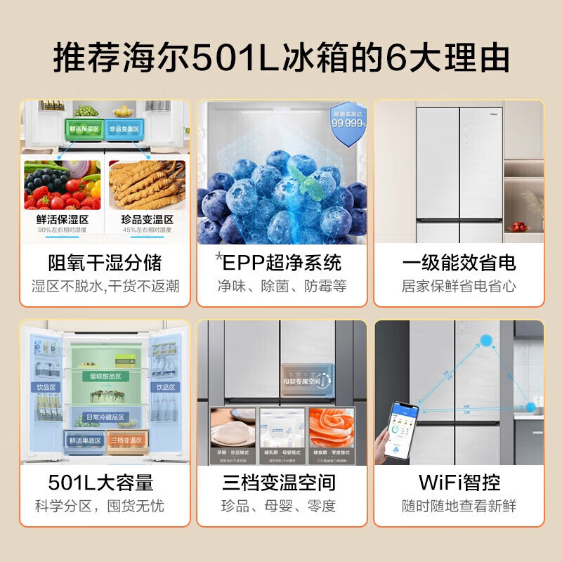 海尔(Haier)冰箱501升 十字四开门一级双变频风冷无霜 EPP多重净化母婴三档变温 BCD-501WGHTD95GQU1价格:6199.00元!