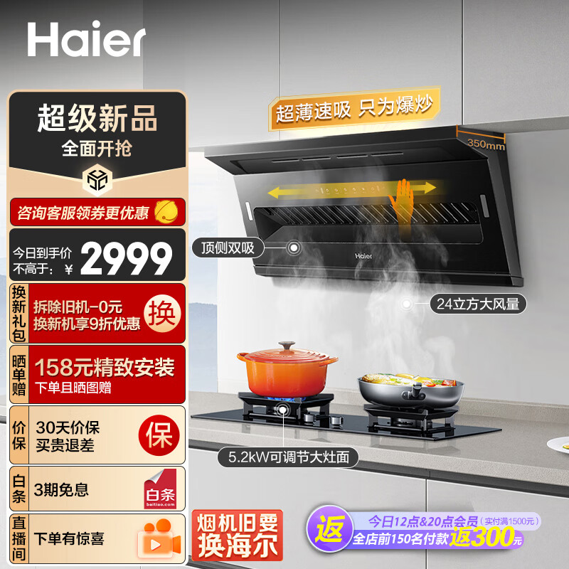 海尔(Haier)抽油烟机 顶侧双吸烟灶套装 24m3/min大吸力 家用顶吸式厨房吸油烟机燃气灶具套装C51+Q7BE3天价格:2999.00元!