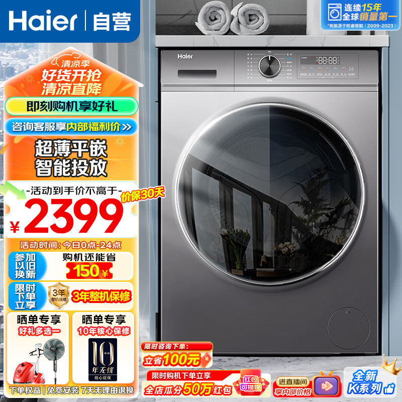 海尔(Haier)K39Pro滚筒洗衣机全自动10KG变频家用洗衣机1.1洗净比超薄平嵌+六维减震+3D净护+智能投放价格:2379.00元!