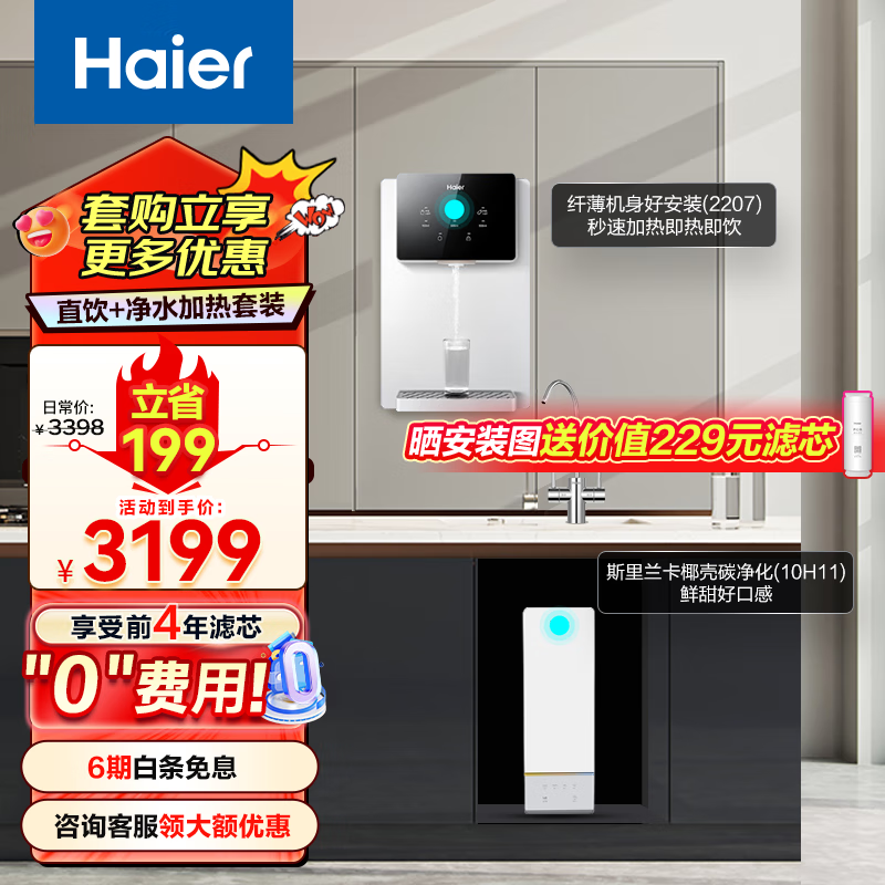 海尔(Haier)直饮加热净水器家用净水机1000G套装双出水厨下式RO反渗透母婴直饮净水器+管线机10H11+HGR2207价格:3199.00元!