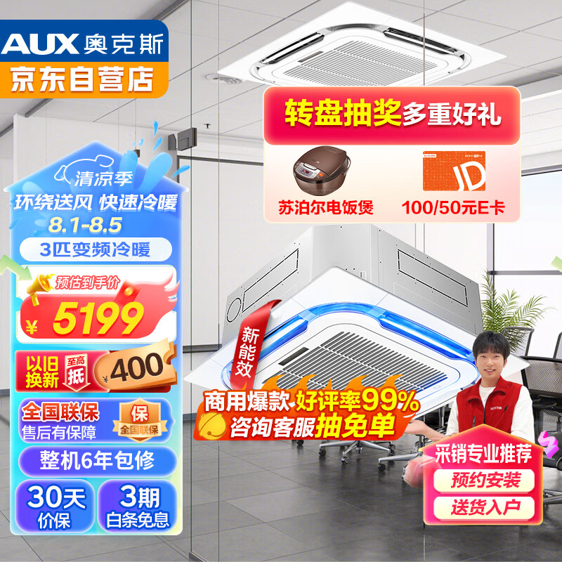 奥克斯(AUX)中央空调天花机3匹变频冷暖吸顶空调嵌入式吊顶空调商用天井机220V KFR72QW/BPR3YD(B3)-G京仓派送价格:5199.00元!
